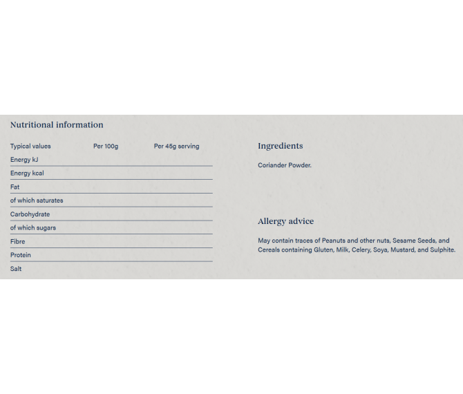 Thicken and flavour curry, gravy, and other sauces with our warming coriander powder. Mellow and bittersweet, this versatile spice can enhance various dishes, from sambhars to salads. It is a cupboard essential to add flavour to your cooking at a moment’s notice.